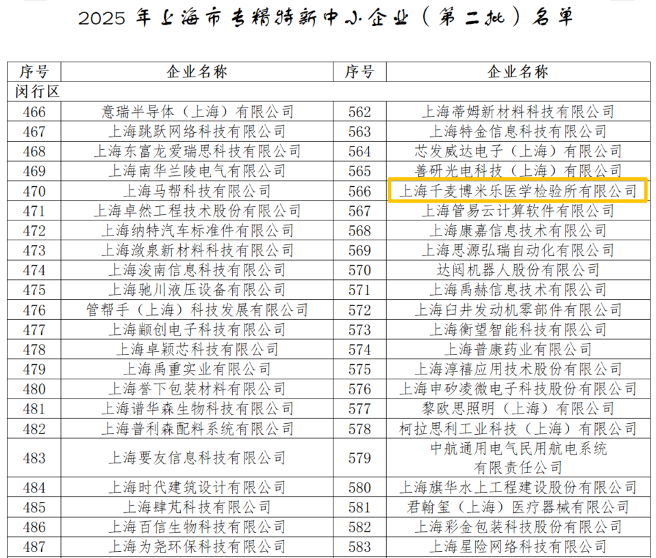 日前,上海市经济和信息化委员会公布2025年上海市专精特新中小企业名单(第二批),千麦医疗集团旗下上海千麦博米乐医学检验所有限公司凭借在医学检验领域的突出表现成功入选。这一荣誉不仅是对上海千麦博米乐医学检验所专业化、精细化、特色化、新颖化发展成果的高度认可,也充分彰显了千麦医疗集团在产业布局与创新发展方面的强劲实力。