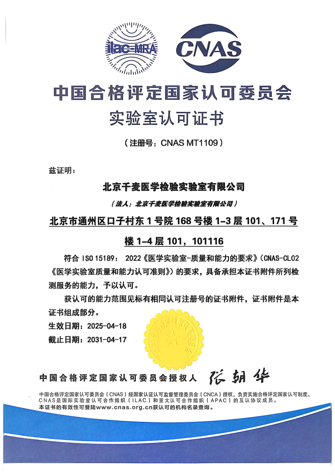 日前,北京千麦医学检验实验室有限公司(以下简称"北京千麦")正式获得中国合格评定国家认可委员会(CNAS)颁发的ISO15189医学实验室认可证书。这不仅是对北京千麦综合实力的高度认可,更代表着其检测质量和技术水...